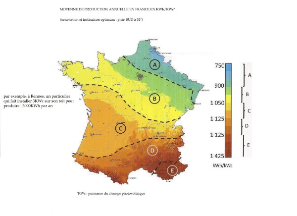 CARTE DE PRODUCTION La carte ci-dessous donne une idée approximative des productions attendues, mais celles-ci varient énormément en fonction de l'ensoleillement. Pour plus de précisions, vous trouverez ci-dessous prochainement un tableau donnant les productions des clients que nous suivons.